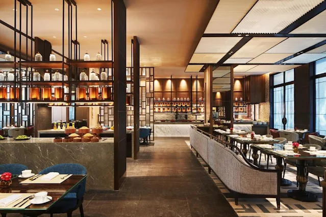 The interior spaces feature a balance of modern design and traditional Chinese elements, including natural materials, intricate patterns, and Asian-inspired artwork. The guest rooms are designed with luxury and comfort in mind, featuring plush bedding, sleek furnishings, and state-of-the-art technology.